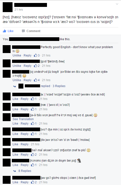IPA stands for International Phonetic Association which is the association that wishes to create a list of characters to represent all the sounds used in languages around the world. In this thread, we were talking to each other using IPA, which means that we could tell what each other’s accents sounded like. It was a lot of fun đ
